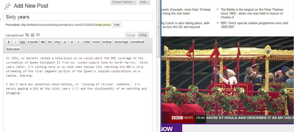 In 1952, my parents rented a television so we could watch the BBC coverage of the coronation of Queen Elizabeth II from our London-suburb home in North Harrow. Sixty years later, I’m sitting here in my home near Kansas City watching on a laptop the BBC’s live-streaming of the river pageant portion of the Queen’s Jubilee celebrations. Amazing.