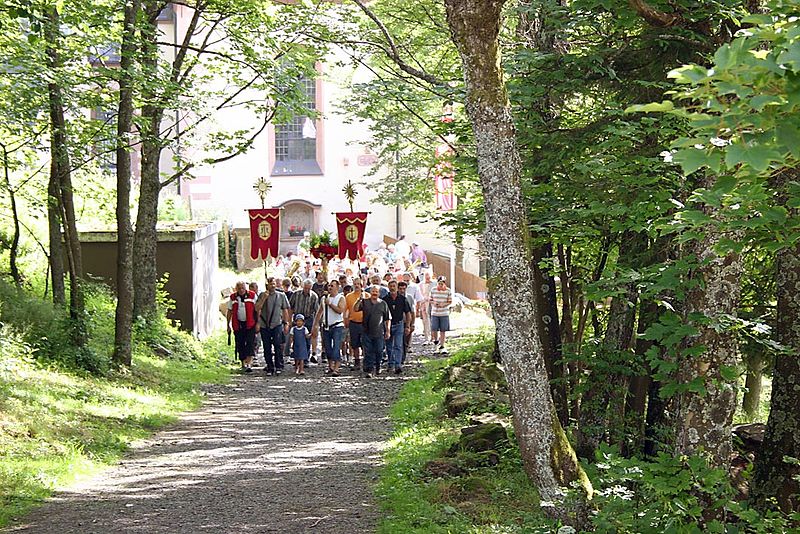 Procession from the Kreuzberg monastery up to the crosses on the mountain. Picture courtesy of Wikpedia.