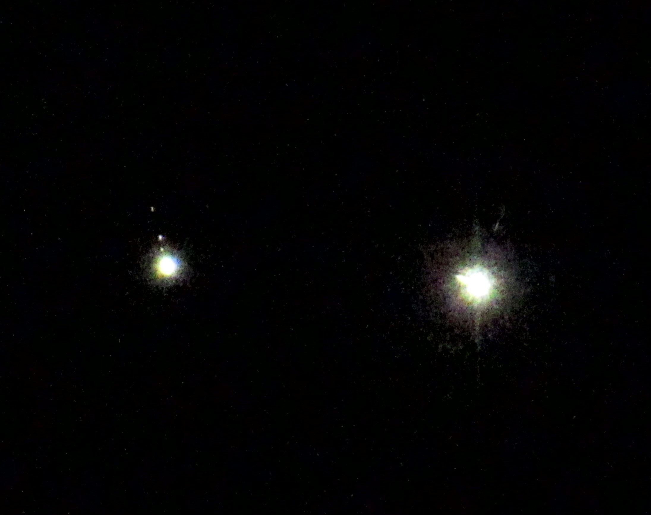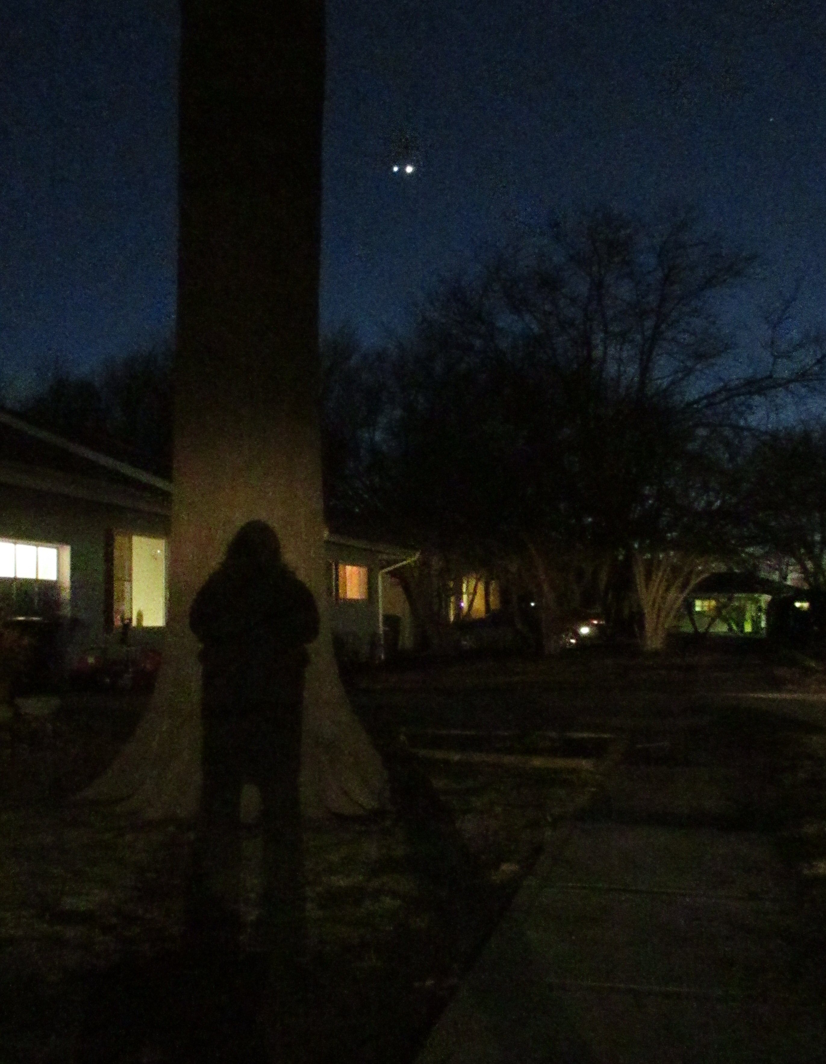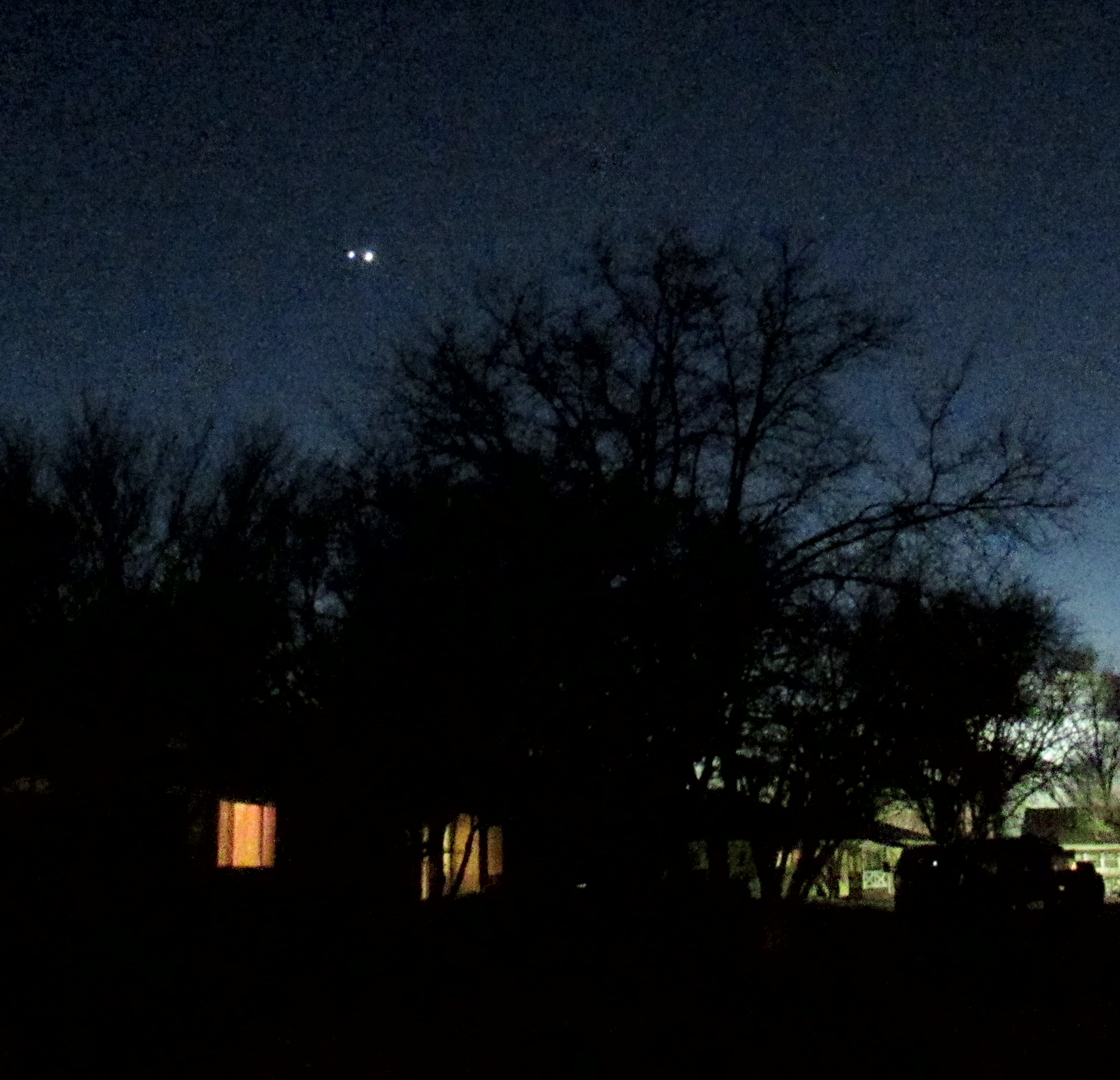 I knew about the then-upcoming conjunction, but “strangely enough” (not), Life got in the way. Luckily, the astral event came to my attention before it was over and I toddled outside with my wee non-astro-camera on a tripod (a Canon Sure Shot). The photos aren’t gee-whiz wonderful, but I caught Jupiter and Venus before they dipped below the western horizon.