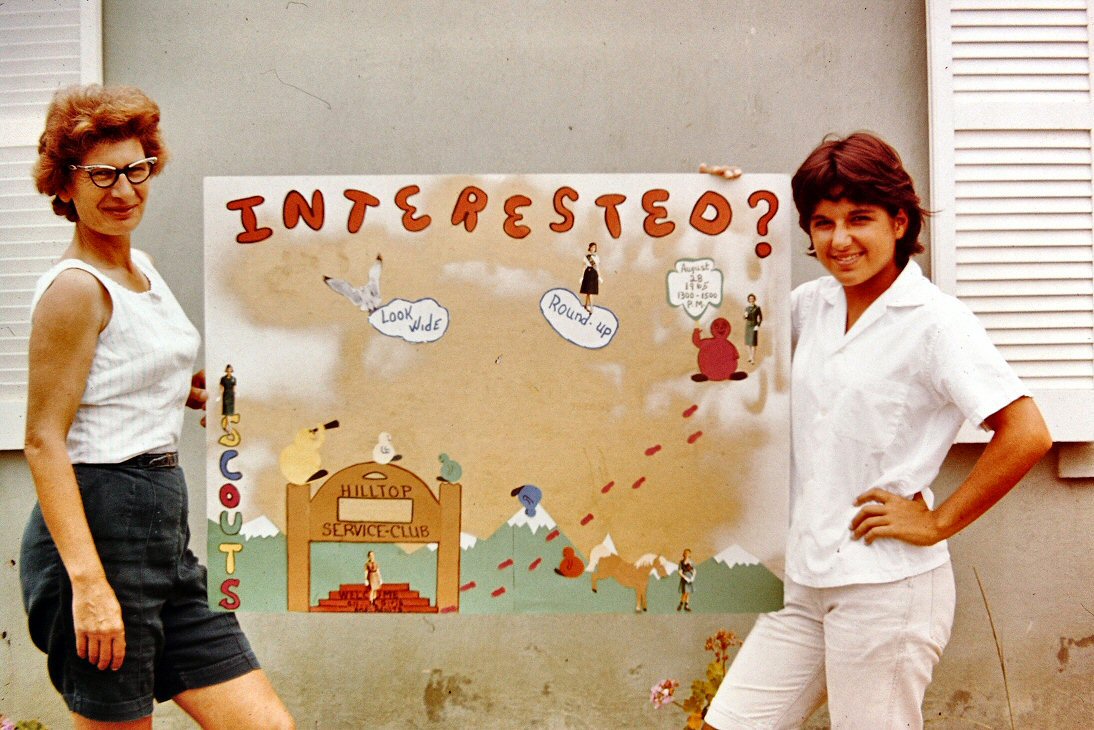 Kindley AFB, Bermuda, 1965: Me and my mom with our pre-clip-art, completely homemade poster for Girl Scouts.