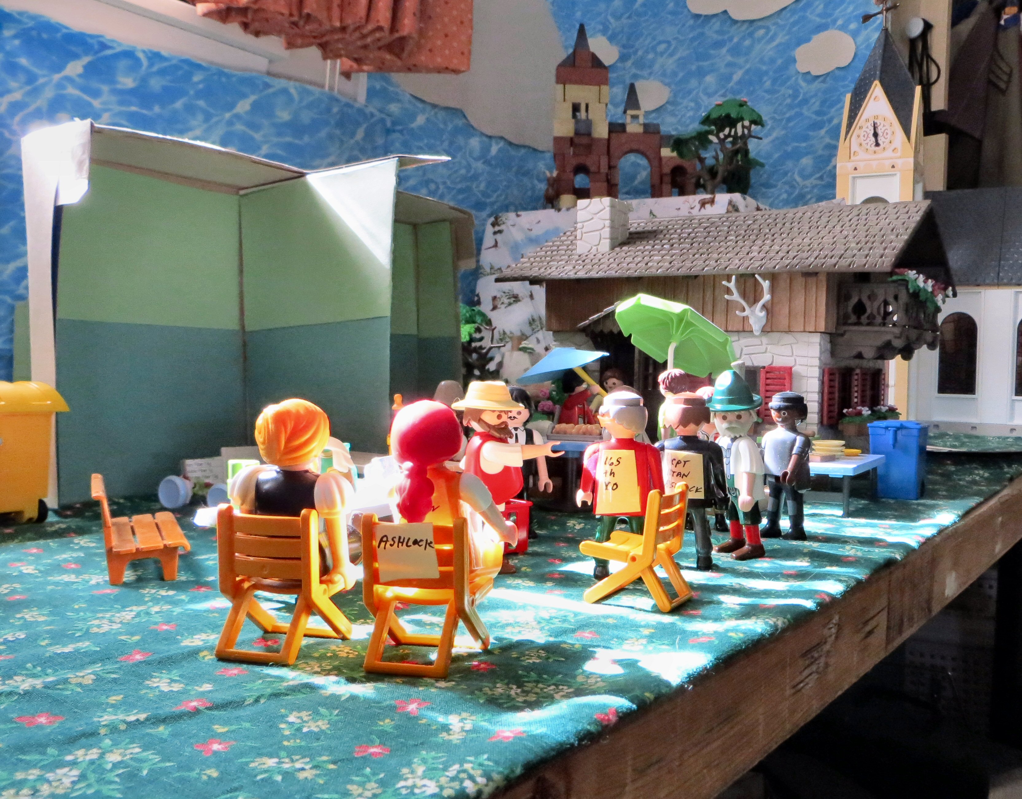 Off to the left is the train station — track numbers, schedules, and a map — which usually wasn’t so close to the border, but my table top has limited real estate.